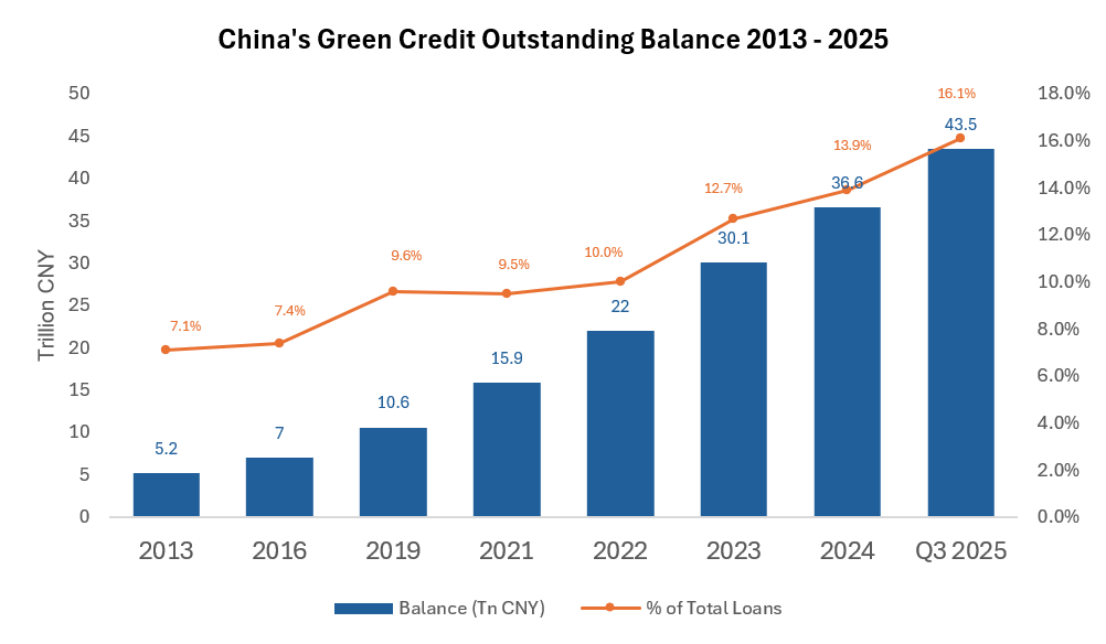 As the accompanying chart illustrates, outstanding green credit balances have grown dramatically over the past twelve years, rising from approximately CNY 5.2 trillion in 2013 to CNY 43.5 trillion by the third quarter of 2025. At the same time, the share of green credit within total bank lending has climbed steadily from 7.1 percent to 16.1 percent. This is not organic market evolution but the outcome of sustained, high-level policy direction from the People’s Bank of China and other regulators.