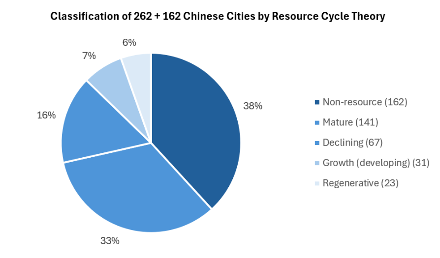 Recent analysis applying Resource Cycle Theory to 424 Chinese cities (162 non-resource and 262 resource-dependent) offers a precise diagnostic. As the accompanying pie chart shows, 38 percent of cities are non-resource based, while among resource cities 33 percent remain in the mature stage of heavy dependence, 16 percent are already classified as declining, and only 6 percent have reached the regenerative stage where diversification has taken hold. This distribution highlights the scale of the transition challenge still ahead.